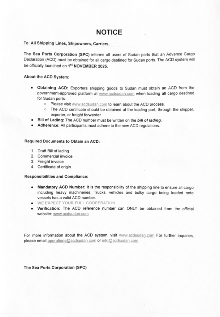 Please note that ACD certification will be mandatory for all shipments destined for Sudan effective 1 January 2026. All concerned parties are required to ensure full compliance with this requirement to prevent shipment delays or possible non-acceptance.